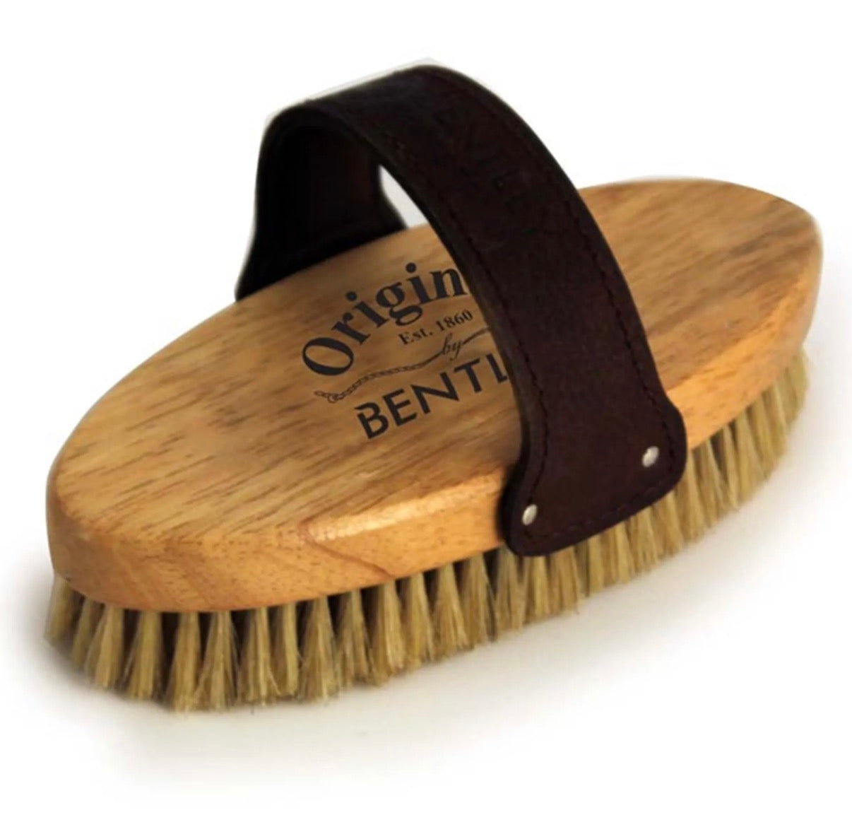 Bentley Wood-Back kroppsbørste er designet for effektiv, men skånsom rengjøring, med en høykvalitets trebakside som sikrer holdbarhet og komfortabel håndtering. Fylt med ren bust glir børsten jevnt over hestens pels, fjerner smuss og rusk samtidig som den gir en sunn, naturlig glans. Lærremmen gir et sikkert grep, noe som forbedrer kontrollen og presisjonen din når du steller hesten din.